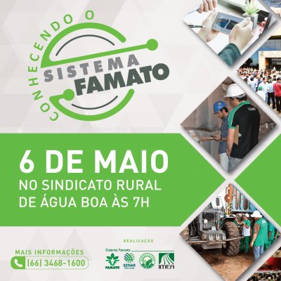 O programa Conhecendo o Sistema Famato, lançado em fevereiro em Cuiabá, segue para a segunda edição, desta vez, no Sindicato Rural de Água Boa. O evento será dia 6 de maio e terá a participação de produtores rurais, presidentes e diretores de Sindicatos Rurais dos municípios de Água Boa, Barra do Garças, Campinápolis, Canarana, Cocalinho, Gaúcha do Norte, Nova Xavantina, Novo São J...