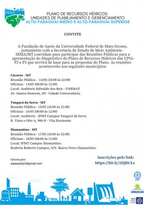 A Federação da Agricultura e Pecuária de Mato Grosso (Famato) sugere aos produtores rurais para participarem das Reuniões Públicas de apresentação do Diagnóstico do Plano de Recursos Hídricos das Unidades de Planejamento e Gerenciamento do Alto Paraguai Médio (P2) e Alto Paraguai Superior (P3). Elas ocorrerão entre os di...