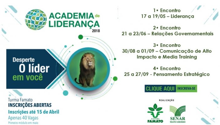 Estão abertas as inscrições para a Academia de Liderança 2018 do Sistema Famato. A inscrições podem ser feitas até o dia 15 de abril pelo link: https://goo.gl/forms/gTDPxLoVCS5cOWWE3. As 40 vagas devem ser preenchidas por presidentes e diretores dos Sindicatos Rurais de Mato Grosso. O diretor de Relações Institucionais da Famato, Jos...