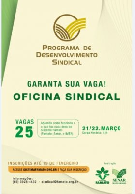 A Federação da Agricultura e Pecuária de Mato Grosso (Famato), em parceria com o Serviço Nacional de Aprendizagem Rural (Senar-MT), está com as inscrições abertas para a “Oficina Sindical”. A oficina faz parte do Programa de Desenvolvimento Sindical (PDS) de 2018. As inscrições podem ser feitas até o dia 19 de fever...