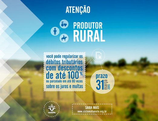A Federação da Agricultura e Pecuária de Mato Grosso (Famato) lembra aos produtores rurais inscritos como pessoas jurídicas, cujo prazo para pagamento da Contribuição Sindical Rural venceu em 31 de janeiro, que ainda podem imprimir a guia de pagamento da contribuição (com juros e multas inclusos) pelo site www.canaldoprodutor.com.br. As guias geradas em fevereiro podem ser pagas até o ú...